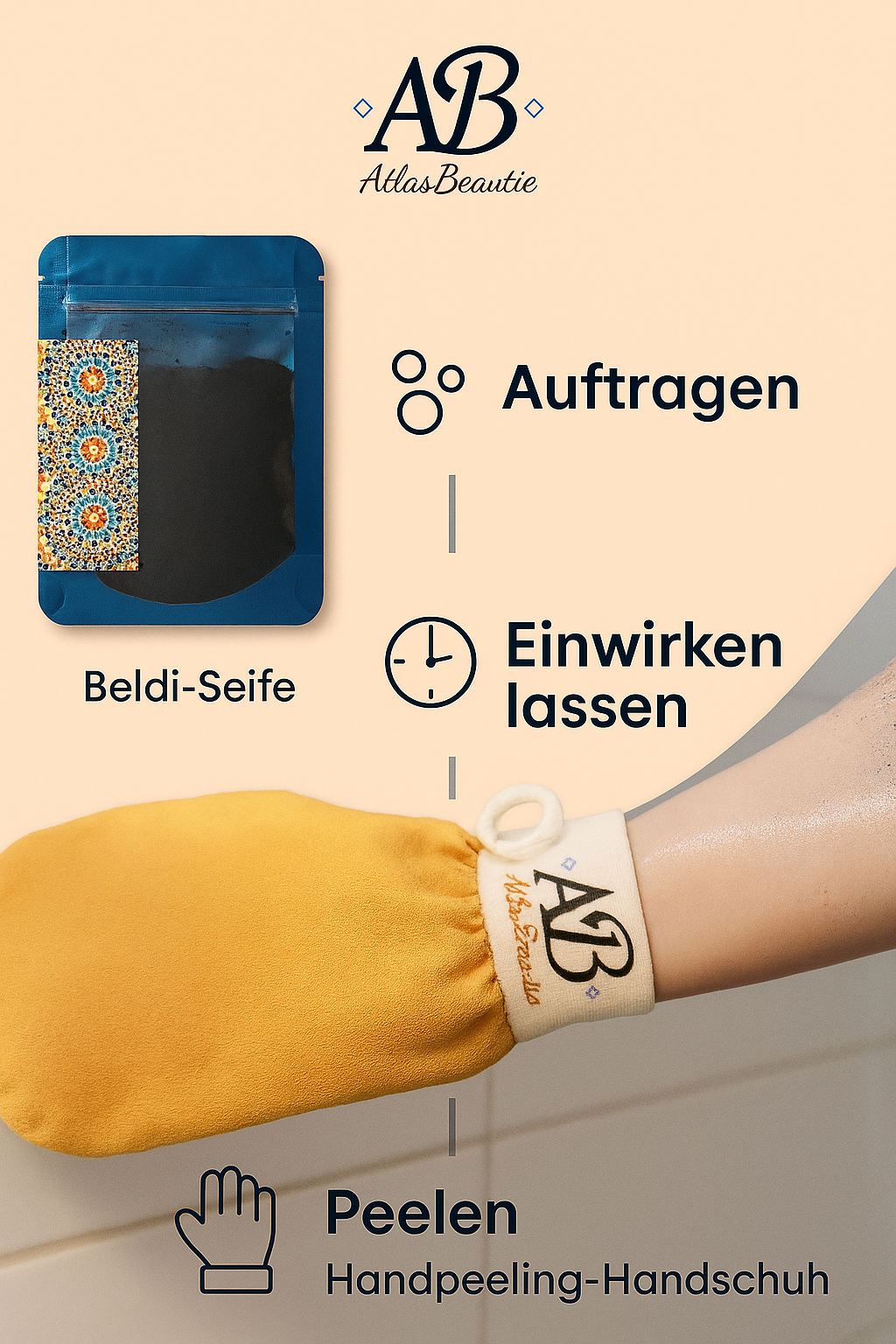 • Beldi‑Seife (200 g) schwarze Olivenseife, bereitet die Haut aufs Peeling vor.